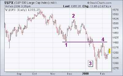 My prior statement about bear markets taking place in five waves is based on Elliott Wave theory. Let's apply the same analysis to the daily chart of the S&P 500. Chart 5 shows the S&P declining in three waves from early October to mid-January (two down waves with an intervening rally). One of the most important Elliott rules is that a wave 4 rebound should never move above the bottom of wave 1 (1400). That's why I recently suggested that the market would have difficulty clearing the 1400 level. As long as it doesn't, there's a strong likelihood of one more (fifth) downwave before the decline from last October is complete. There's another Elliott rule which is worth keeping in mind. Wave 5 is usually at least as long as wave 1. Wave 1 fell from 1575 to 1400 (-175 points). Subtracting that 175 points from the top of Wave 4 (1400) gives a potential target to 1225. The 1225 level corresponds to the bottom formed during the spring of 2006 (Chart 6). That's the next logical support level (and target) if the downtrend resumes. In order to disturb the orderly downtrend, the S&P 500 (and the other market indexes) would have to close decisively over their late-January highs.